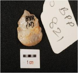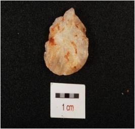 | Description / विवरण | A Scraper made on quartz. Prepared platform, Diffused bulb on ventral side and use wear mark along cutting edges. |