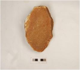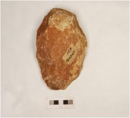 | Description / विवरण | Side scraper with retouches along the side, striking platform visible, flake scars and cortex visible on surface. |