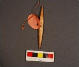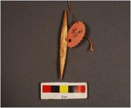 | Description / विवरण | Bone arrow head, pointed ends, thin but slightly thick and pierced from middle, stains are visible, yellow in colour. |