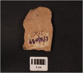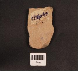 | Description / विवरण | A side scraper, made on end struck flake, prepared platform, diffused bulb on ventral and irregular retouch at cutting edge. |