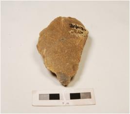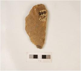 | Description / विवरण | A side scraper on end struck flake, alternate flaking on dorsal diffused bulb on ventral and irregular retouches on edges. |