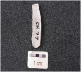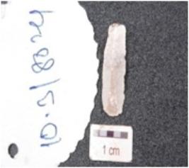 | Description / विवरण | A stone blade, mid ridge on dorsal, ventral is smooth, diffused bulb at proximal end and use wear marks on edge. |