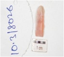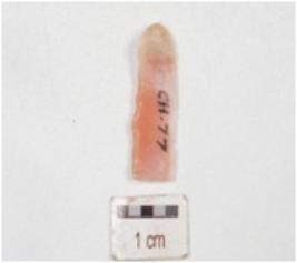 | Description / विवरण | A chert blade, ridge on dorsal, ventral is smooth with prominent bulb and use wear marks on edge. |