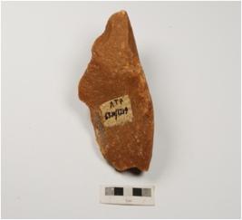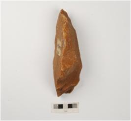 | Description / विवरण | A chopper tool with flake scars on one side and partly retouched on one end. |