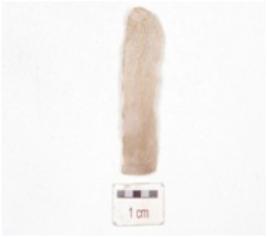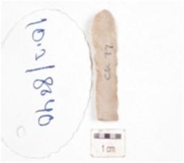 | Description / विवरण | A blade of chert, mid ridge on dorsal, ventral is smooth with prominent bulb and use wear marks on edge. |