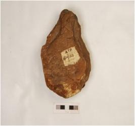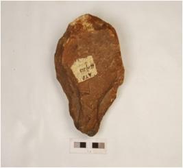 | Description / विवरण | Handaxe made on pebble with a wavy working edge on flakings also visible on surface and soft hammer technique used. |