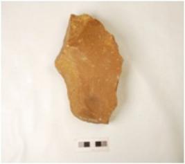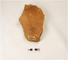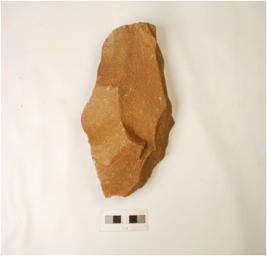 | Description / विवरण | A handaxe with flake scars on the surface using block-on-block technique, prepared platform and irregular edges. |