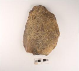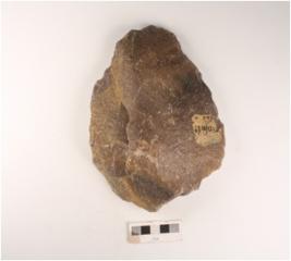 | Description / विवरण | A stone handaxe on side struck flake, irregular retouching marks on edges, Its unifacial and flaking marks on surface. |