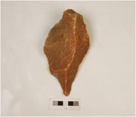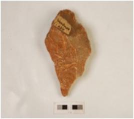 | Description / विवरण | A handaxe made on quartzite stone, alternate flaking marks on both sides irregular retiches on edges and pointed anterior end. |