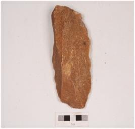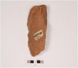 | Description / विवरण | A unifacial handaxe made on quartzite with irregular retouch along the cutting edges, flake scars on the dorsal prepared platform and diffused bulb on ventral side. |