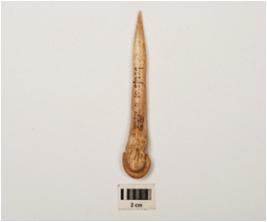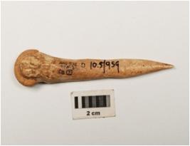 | Description / विवरण | Bone point, slightly broken pointed end, modified convex top, groove line on one side and polished surface. |