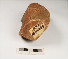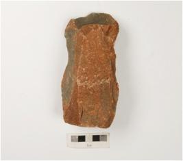 | Description / विवरण | A bifacial handaxe, made on quartzite by applying block on block technique, prepared platform, edges are prepared by using alternate flaking technique, one thick butt end and broken along at distal end. |