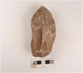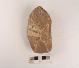 | Description / विवरण | A stone handaxe on end-struck flake, retouching marks on edges and prepared platform. |