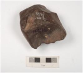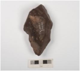 | Description / विवरण | A miniature handaxe made on basalt with prepared platform, flake scars and small pores on dorsal and ventral side with irregular retouches on working edge. |