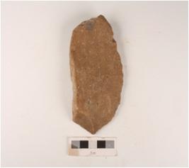 | Description / विवरण | A quartzite side scraper made on end struck flake, irregular retouch on right side cutting edges, prepared platform and prominent bulb on ventral side. |