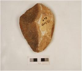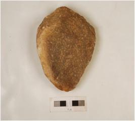 | Description / विवरण | Chopping, bifacial, cortex visible on one side and flake scars visible on sides. |