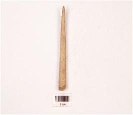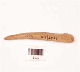 | Description / विवरण | Fragment of a bone point, circular in section, porous on the surface, slightly broken at broad end, pointed at other side and polished both sides. |