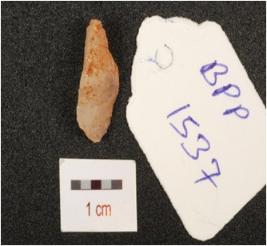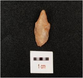 | Description / विवरण | Debitage made on quartz. Uneven shape. Cortax visible on one side and use wear mark along cutting edges. |
