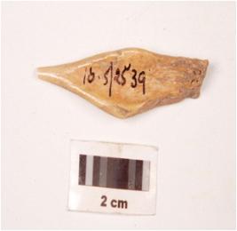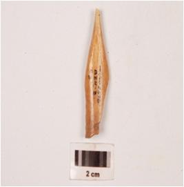 | Description / विवरण | Fragment of a bone point with plano-convex in section, polished both sides, slightly broken at one end, pointed broken other end and smooth surface. |
