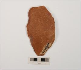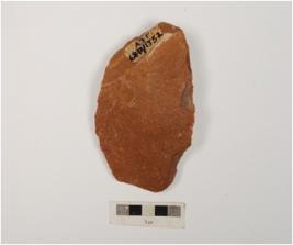 | Description / विवरण | A side scraper on end struck flake with prominent bulb on ventral surface, prepared platform, smooth and flat on dorsal side and partly retouched left cutting edge. |