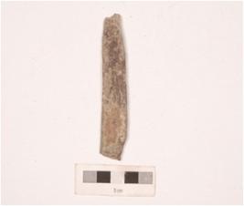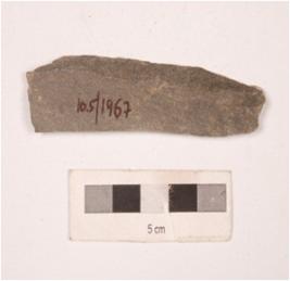 | Description / विवरण | Fragment of a stone point flat in section, slightly broken both end and smooth surface. |