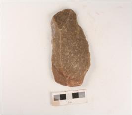 | Description / विवरण | A double sided scraper, unifacial with flake scars on dorsal, prepared platform and irregular retouches on both cutting edges. |