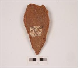 | Description / विवरण | A triangular shapedhand axe made on quartzite with a ridge on the dorsal irregular retouches on working edges and it is bifacial. |
