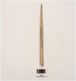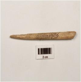 | Description / विवरण | Fragment of bone point, polished surface slightly chipped off, circular cross section, pointed end slightly damaged and other end broken. |