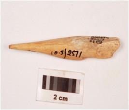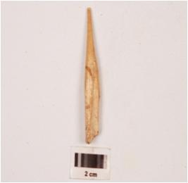 | Description / विवरण | Fragment of a bone point, with slightly broken at one end, pointed at other end and polished surface. |
