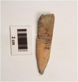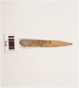 | Description / विवरण | A bone point with flat surface and tapered to-wards pointed end, groove on other side, rectangular in section and pointed end slightly damaged. |