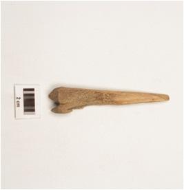 | Description / विवरण | A bone point with flat surface, pointed one end broken, other end thick, polished surface and rectangular in section. |