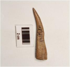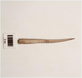 | Description / विवरण | A bone point with flat surface, well polished, hollow from inside, slightly curved, pointed one end other end thick and rectangular in section. |