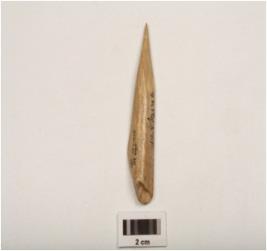 | Description / विवरण | A bone awl with polished surface, tapered towards one pointed end, other end thick and triangular in section. |