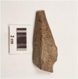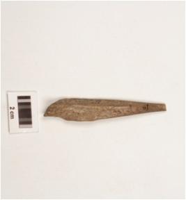| Description / विवरण | Bone point with flat surface, a mid-ridge on one side, pointed one end slightly damaged and polished surface. |