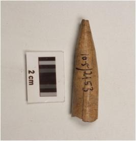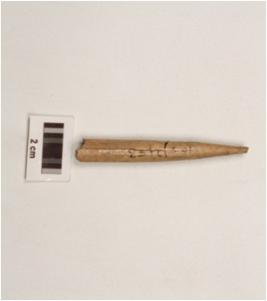 | Description / विवरण | Fragment of bone point with tapered on one end, cracks on polished surface, oval cross section and pointed end slightly damaged. |
