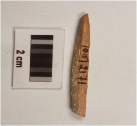 | Description / विवरण | Fragment of bone point, circular in section, pointed one end slightly damaged and polished surface. |