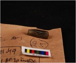 | Description / विवरण | A Chert blade with prominent mid ridge on dorsal, smooth ventral and triangular section. |