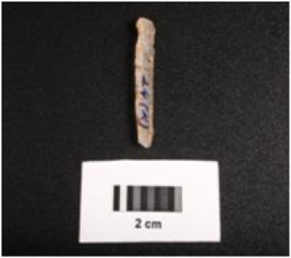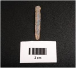 | Description / विवरण | Parallel sided microlithic blade with prominent mid ridge on dorsal, trapezoidal in section and use wear marks on cutting edges and bulb on ventral. |
