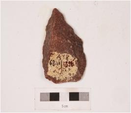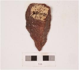 | Description / विवरण | A handaxe made on a quartzite with prepared platform, irregular cutting edges and pounted anterior end. |