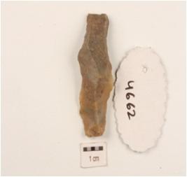 | Description / विवरण | Blade made on end struck chert flake, flake scars on dorsal surface, positive bulb on ventral surface, trapezoidal in section, retouches along cutting edges. |