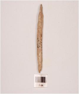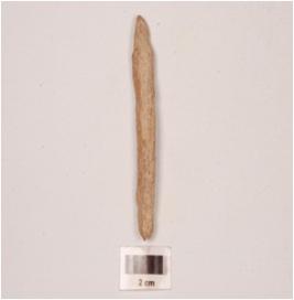 | Description / विवरण | A bone point with rectangular cross section, polished and partly porous surface and tip broken. |
