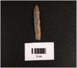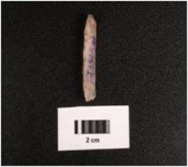 | Description / विवरण | Parallel sided microlithic blade with a prominent mid ridge on dorsal diffused bulb on ventral use wear marks along cutting edges and broken at distal end. |