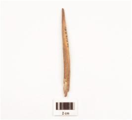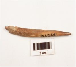 | Description / विवरण | Fragment of a bone point tapering towards a end, broken tip, smooth and polished surface, broken in colour and broken along other end. |