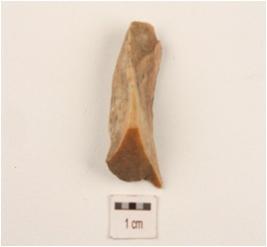 | Description / विवरण | Flake made on chert, flake scars on surface, use wear marks along cutting edge. |