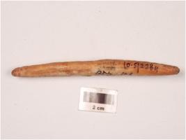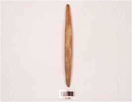 | Description / विवरण | A bone point with polished and partly porous surface, tapering towards the pointed ends and tip broken. |