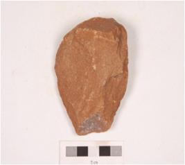 | Description / विवरण | A side scraper made on quartzite end struck flake with prepared platform, flake scars on both sides and irregularly retouched edge. |