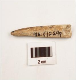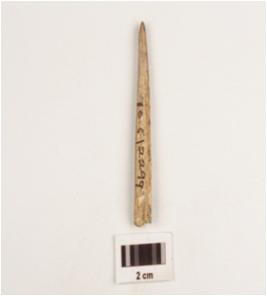 | Description / विवरण | Fragment of a bone point polished surface, light brown in colour, rectangular in section and broken along other end. |