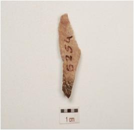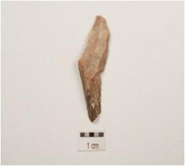 | Description / विवरण | Chert blade with two ridges on dorsal side, striking platform, diffused bulb on ventral side, cortex visible on partly broken distal end use wear marks on cutting edges, slightly bent from the middle and trapezoidal in section. |