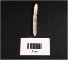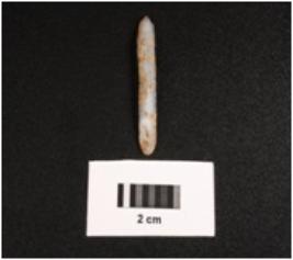 | Description / विवरण | Parallel sided microlithic blade with prominent mid ridge on dorsal, diffused bulb, triangular section and use wear marks on cutting edges. |