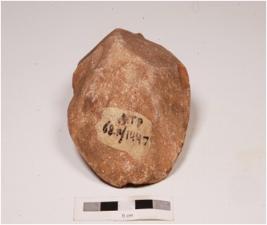 | Description / विवरण | A bifacial handaxe made on quartzite, pear shaped with cortex on butt end and tapering sides. |